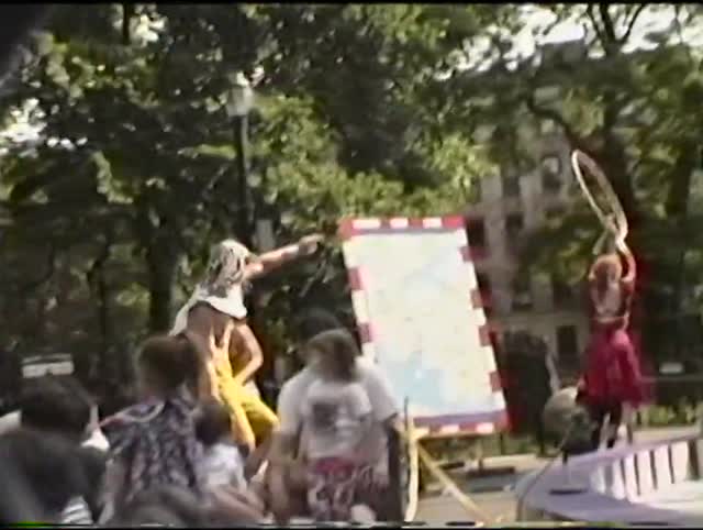 Video documentation of Circus Amoks show, NY: Ground Under II, performed in 1995 in diverse NYC parks, squares and other public spaces. The piece revolves around political, social and economic issues at play in New York City, while posing a critique of the disconnect between the needs of the diverse, multitudinous population of NYC vis-à-vis oppressive governmental policies impacting the city. Skits include a 'short history of NY', highlighting the geopolitical diversity of the city, along with scenes alluding to controversial budget cuts, public transportation campaigns, etc. Satires of Republican political figures like Newt Gingrich (58th Speaker of the U.S. House of Representatives), George Pataki (53rd Governor of New York), and Rudy Giuliani (Mayor of NYC at the time) place the piece in the context of contemporary issues affecting the citizens of NYC, exposing controversial policies while educating and entertaining the audience in a joyful extravaganza of acrobatic artistry, satiric skill, and good old-fashioned circus fun. Circus Amok (www.circusamok.org) is a New York City based circus-theater company whose mission is to provide free public art addressing contemporary issues of social justice to the people of New York City. Directed and founded by Jennifer Miller, the group has been together since 1989 bringing its funny, queer, caustic and sexy, political one-ring spectacles to diverse neighborhoods throughout the city. Over the years the traditional circus skills - tight rope walking, juggling, acrobatics, stilt walking, clowning- have been combined with experimental dance, lifesize puppetry, music old and new, and gender-bending performance art and improvisational techniques, creating new meanings for circus while continuing to entertain the crowds of all ages throughout the city streets, gardens, parks, and playgrounds, inviting the audience to join them in envisioning a more empowered life of community interaction while enjoying a queer celebratory spectacle. Hemispheric Institute of Performance and Politics